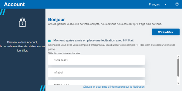 Account est l’application d’authentification développée pour HR Rail. Elle est accessible aux actifs de HR Rail, aux détachés et aux pensionnés de retraite. Cliquez sur « s’identifier » pour y accéder.